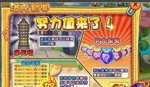玩家还可以使用努力果来获得努力值。通过参加通天塔得到很多努力果果,每种不同的努力果果增加相应的宠物天赋值。