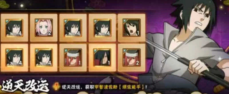 在7月2日至7月15日期间,达到20级的玩家可以进行免费进行10连招募。招募完成后可以选择其中一个结果进行“逆天改运”,改变招募结果。通过道具“神之力”可以提升改运值,当改运值达到100时进行改运必得宇智波佐助[须佐能乎]碎片。