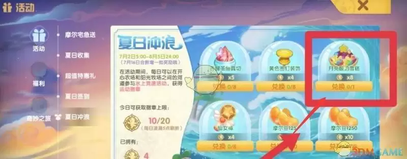 3、在兑换页面找到月亮酸奶雪糕,使用10个运动徽章,点击兑换,即可获得月亮酸奶雪糕菜谱。