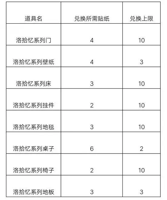 洛克王国十一周年庆期间,洛拾忆系列家具可以通过纪念贴纸兑换。全套洛拾忆系列家具包含:洛抬忆系列门、洛拾忆系列壁纸、洛拾忆系列床、洛拾忆系列挂件、洛拾忆系列地毯、洛拾忆系列桌子、洛拾忆系列椅子、洛拾忆系列地板,其中桌子的兑换最贵,需要6个贴纸,上限两个。