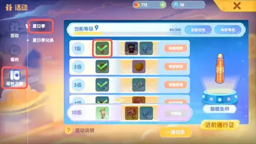 2.在左侧切换到【奇妙之旅】活动,当【夏日季】等级达到1一级时可获得该奖励;