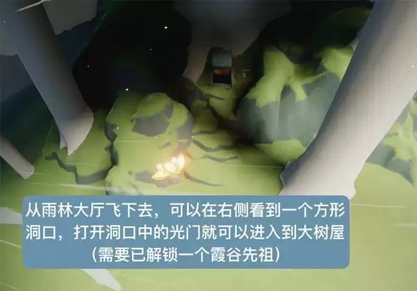 1、先来到雨林大厅,飞过云洞到草坪,从洞里进去到树屋地图。