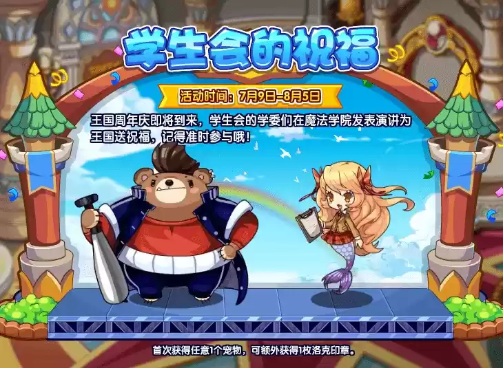 学生会的祝福活动地图是在:魔法课教室。活动时间:7月9日-8月5日。学生会的学委们在魔法学院发表演将为王国送祝福,活动奖励比较多,热血班长德玛、学习委员艾迪、文艺委员酥酥、狗头策划小北、美男子国柱,洛克印章都有机会获取!