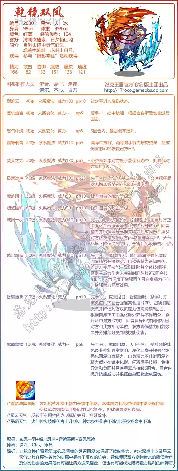 乾镜双凤在洛克王国游戏中编号是:2030,属性:火、冰。技能搭配推荐:鸾凤舞镜+昏镜重明+麟出凤鸣+威凤一羽。性格推荐:保守、冷静、胆小。