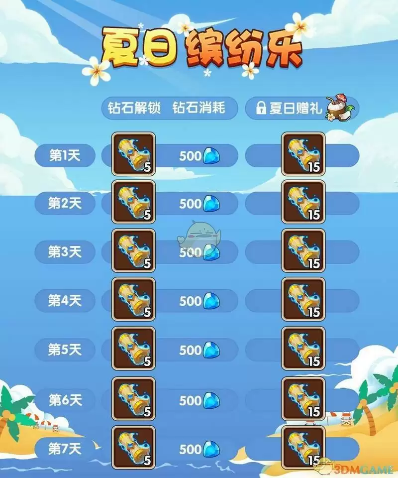 活动期间,夏日缤纷乐将每天解锁一份礼物,大家可消耗钻石进行购买。另外,购买夏日赠礼还可解锁夏日缤纷乐的额外奖励~