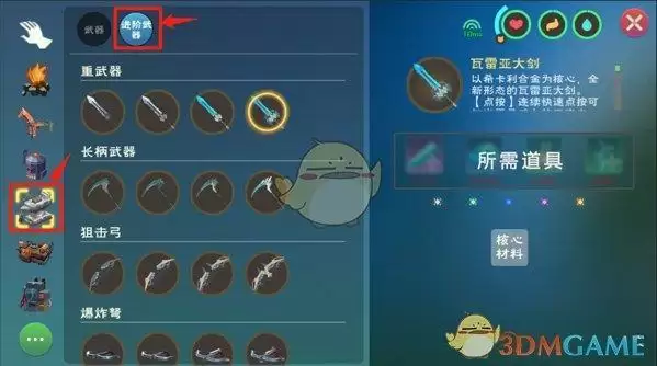 大剑可由剑类武器改造而成,为近战武器,有点按攻击和长按蓄力攻击两种攻击方式,伤害较高