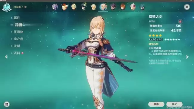 琴这个角色4星武器(有5星带五星)我更偏向使用腐殖之剑,圣遗物主属性攻风爆,这也导致攻击面板偏低1800-1900左右,所以也可以使用角斗士追忆的2+2组合保证攻击和奶量。