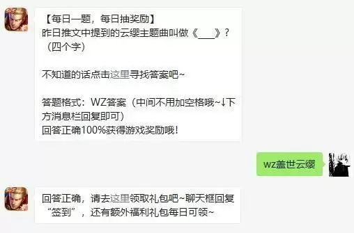 王者荣耀每日一问的问题是关于云缨主题曲的,很多玩家不知道这个答案是什么。其实这个答案还是很容易的,想要知道这个答案是什么的,就一起来看本次答案吧。