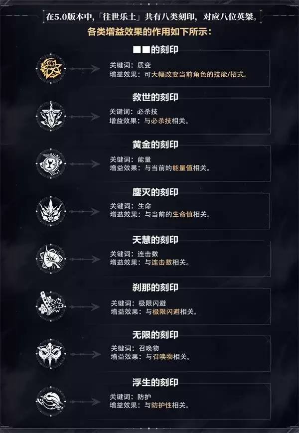 在「往世乐土」中存在着多种「刻印」,「刻印」可以在关卡战斗中,为女武神带来增益效果,强化战斗力,看下方长图快速了解吧!