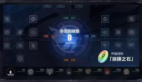 「命定的歧路」系统,共分「歧路·庇护」、「歧路·财富」、「歧路·斗争」、「歧路·欢宴」四个不同的分支。点亮不同的分支点位可以为舰长带来增益效果。通过完成关卡挑战,可以获取各分支点位的升级材料「抉择之石」。