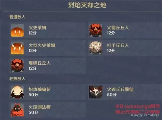 普通敌人:火史莱姆*8,打手丘丘人*3,爆弹丘丘人*3