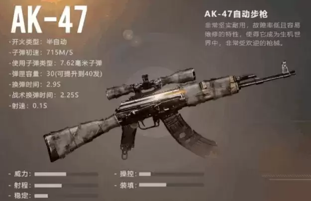 ak47在黎明觉醒中算的上是一个非常常见的一款枪了,制作起来也比较容易,加上它是步枪中伤害最高的,打僵尸也是二、三枪就能消灭一个了,但缺点也很明显就是后坐力较大,扫射起来比较没有准头,因此打成群的僵尸还行,而遇到其他玩家,这把枪还是有一定劣势的。