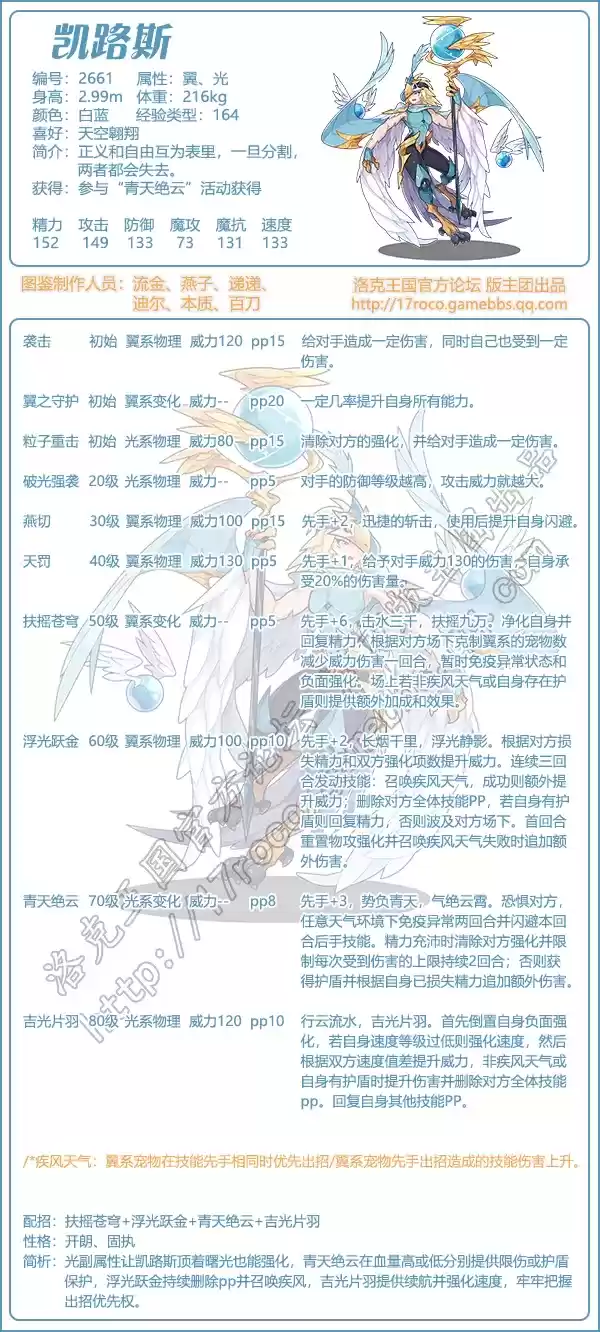 技能配招推荐使用:扶摇苍穹+浮光跃金+青天绝云+吉光片羽。洛克王国游戏中凯路斯是一个物攻宠物,带四专属就好。2021周年庆期间可以通过小生的仿真宝箱获取。