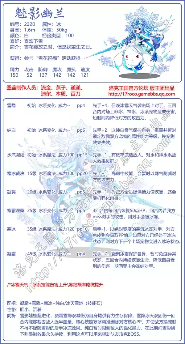 洛克王国游戏中魅影幽兰技能配招推荐:凝霜+雪隐+寒冰+纯白/水天雪地(技能石),性格:胆小、沉着。周年庆期间可以通过小生的仿真宝箱获取。