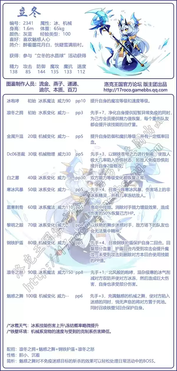 技能配招:凛冬之拥+魅惑之舞+钢铁护盾+凛冬之怒。立冬种族值之和为747(较高),其中生命138还不错,攻击85偏弱,速度112一般般,魔攻135还行,双防一个144,一个133都比较高。总体能力较肉,走魔攻流,速度靠不住。技能上有150高威力技能,有控制技能(推荐圣裁),回血能力较强。