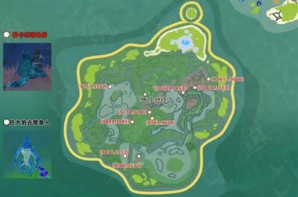 1、如下图所示,巨大的古怪鱼人位置就在白色标记点位置,大家可以直接前往击杀。