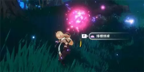 首先空中的粉紫色团簇,要对其释放【雷元素】的技能,才会转化成可采集的绯樱绣球。