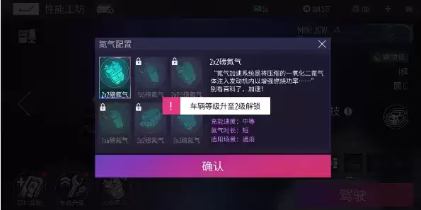 氮气属于是车辆加速的重要装置,一共有六种,随车辆升级依次解锁,不同配置的充能速度、氮气时长与适用场景均有所不同需要根据挑战地图来选择。