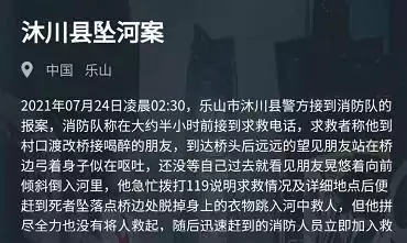 2021年07月24日凌晨02:30,乐山市沐川县警方接到消防队的报案,消防队称在大约半小时前接到求救电话,求救者称他到村口渡改桥接喝醉的朋友,到达桥头后远远的望见朋友站在桥边弓着身子似在呕吐,还没等自己过去就看见朋友晃悠着向前倾斜倒入河里他急忙拨打119说明求救情况及详细地点后便赶到死者坠落点桥边处脱掉身上的衣物跳入河中救人,但他拼尽全力也没有将人救起,随后迅速赶到的消防人员立即加入救援,但死者被打捞上来时已失去生命迹象,随后消防队拨通了报警电话。