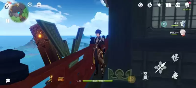 万叶爬上柱子,长按E起飞。上房顶。继续爬翅膀形飞檐万叶跳飞(温蒂,刻晴,岩主都可以)