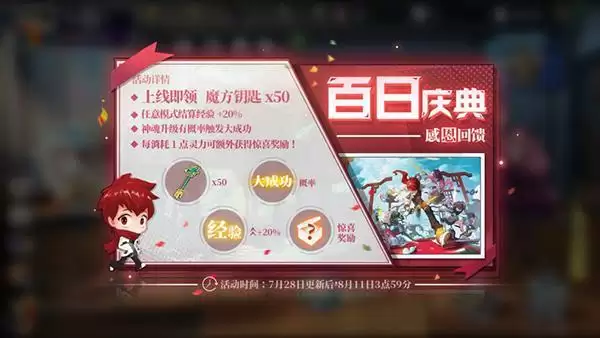 《奇门之上》7月28日全新版本已经上线,同时也将迎来游戏的百日庆典,官方也是为玩家提供了大量的游戏福利以及活动参与,在经验以及道具上出售也是相当大方,同时在其他的渠道也有着不同的奖励,下面就来看下具体内容。