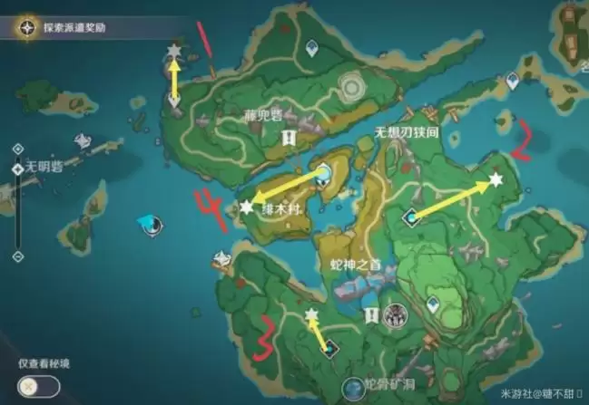 需要根据顺序去找去,不然就是没完成没有宝箱的,六角星所在的地方就是文本的位置,我用红色数字标了顺序,黄色剪头路径。