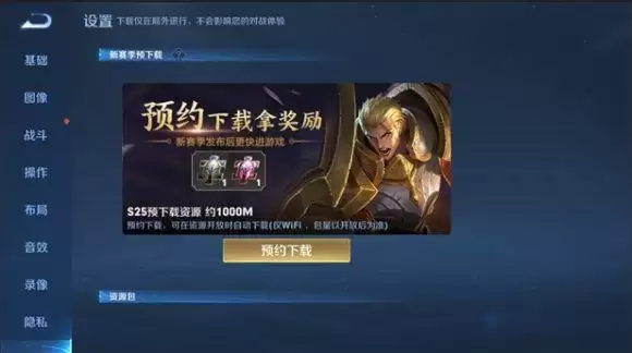 1、在设置-下载界面,将新增新赛季预下载功能,点击预约下载,可预约下载下个赛季的资源,同时还可以获得英雄碎片*1和皮肤碎片*1的奖励,预约下载功能和奖励将在每个赛季更新后重置;
