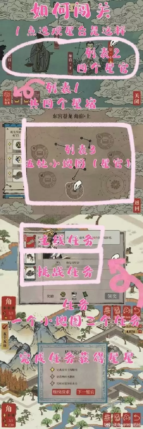 3、观星台任务攻略:点观星台那个建筑,依次点进套娃星宿列表,逐一完成每个星官的任务,完成任务时注意马蓬瀛给的提醒!按照提醒来完成!