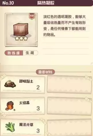 隔热凝胶的配方为:甜味黏土+火结晶+魔法草,而想要得到完美就需要控制配方原料的用量,这里都是加少量。