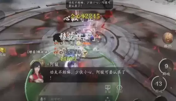 95%血量,BOSS释放该技能。各位少侠看好BOSS血量,可以卡点开格挡,尽量减轻天香压力。