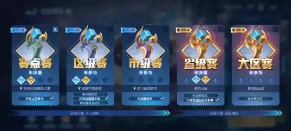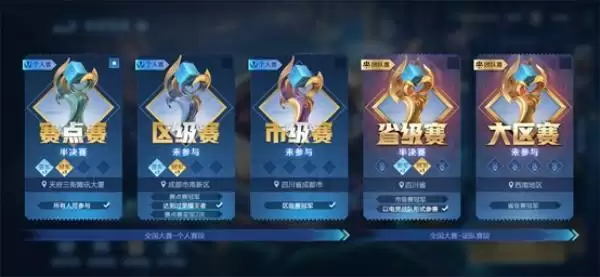 全国大赛共有五个级别的比赛,首月开赛,将从赛点级和区级开始,在赛点赛达成冠军,获得两次亚军或者达到过荣耀王者,可以进入区级赛。