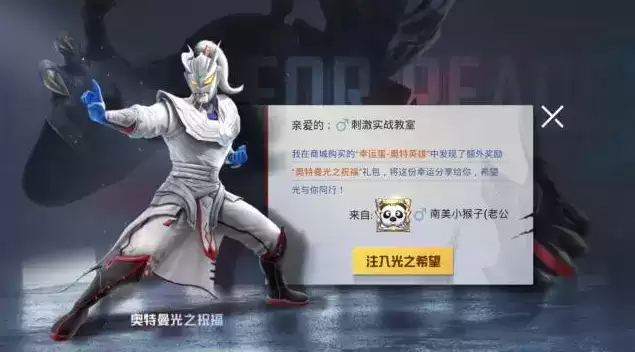 和平精英中玩家获得奥特英雄幸运蛋后,开启奥特英雄幸运蛋可以获得奥特曼光之祝福,很多玩家拿到了奥特曼光之祝福,和平精英奥特曼光之祝福是什么,奥特曼光之祝福怎么用,游乐小编来为大家介绍。