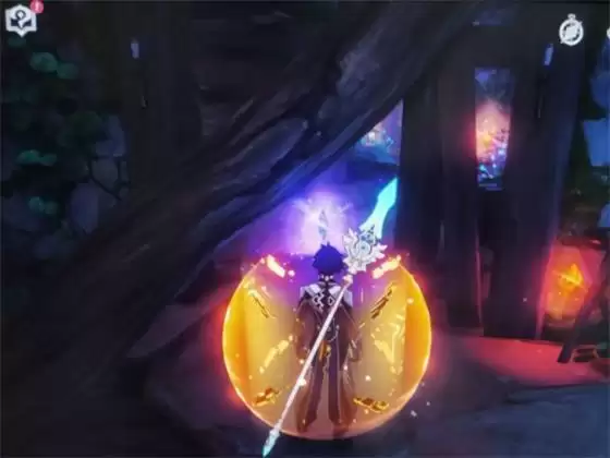 旁边有个雷巨石,可用大剑,岩系技能击破,进去后……,左上角有宝箱如图,跟随雷仙灵,解锁一个普通宝箱