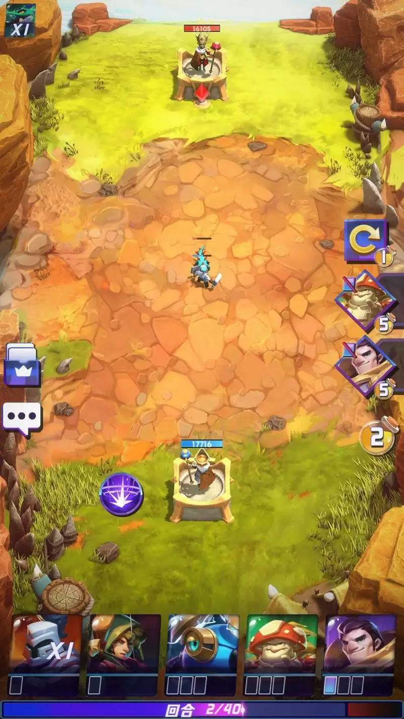 卡牌被部署后,将在回合初始出现在战场上,自动向着敌方王城移动,并在途中向进入攻击范围的敌方单位发动攻击,游戏的玩法有点类似皇室战争。