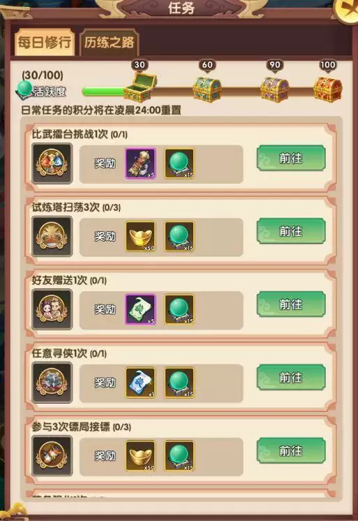 在任务板块中,每日修行和历练之路千万不要错过,完成相关任务,可得到对应奖励。任务总结就是修行简单,奖励丰厚,每天必做。历练之路是终身成长任务,每日都可以获得奖励,最高可以达到武林至尊。
