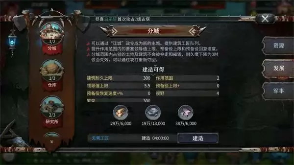 3、灵活使用分城功能,让你的城市藏的很隐蔽,分城功能在主城9级后升级法典技能后开启,分城在游戏中非常重要,相当于给了你一次自由选择落地的机会,对于国王来说,前期暴漏坐标后的风险可以利用分城来解决,选择分城地点最重要的是要确保安全,其次再追求资源,确保你的王国安然无恙。