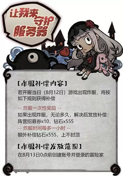 如果出现炸服,无论多久,解决后发放补偿:阵营招募券x10,钻石x555。