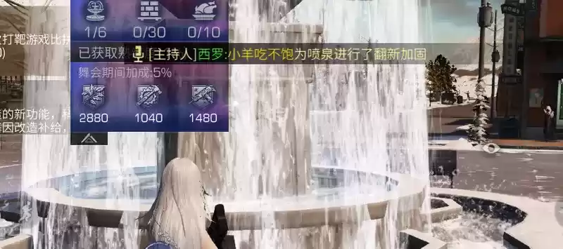 在舞会开始前,营地成员需要到喷泉旁加固喷泉,可以获得新币*400、营地贡献*30(每人每天只可以加固一次)。