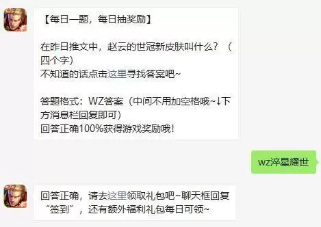 王者荣耀每日一问的问题是关于赵云的,这次上线赵云的世冠皮肤,很多玩家不知道这个答案是什么,想要知道答案是什么的小伙伴们,就让小编给大家详细的讲讲,一起来看看吧。