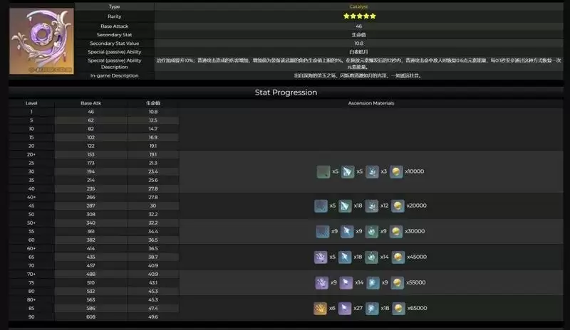 普通攻击造成的伤害增加,增加值为装备该武器的角色生命值上限的1/1.5/2/2.5/3%。在施放元素爆发后的12秒内,普通攻击命中敌人时恢复0.6点元素能量,每0.1秒至多通过这种方式恢复一次元素能量。