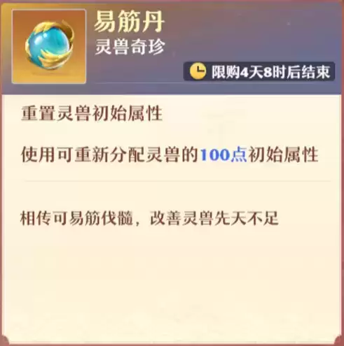 新增道具“易筋丹”,使用“易筋丹”后可重置灵兽初始属性,重新分配灵兽的100点初始属性,使灵兽易筋伐髓,改善先天不足。世界等级达到50级,且角色等级达到50级后,可前往商行、武勋商店购买“易筋丹”。此外仙师试炼中也将随机掉落“易筋丹”,仙师星级越高掉落的概率就越大哟~