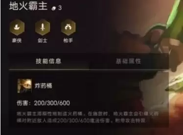 1、地火霸主是一个群伤魔法炮台,特点是拥有3个羁绊,分别是豪侠、 剑士、枪手