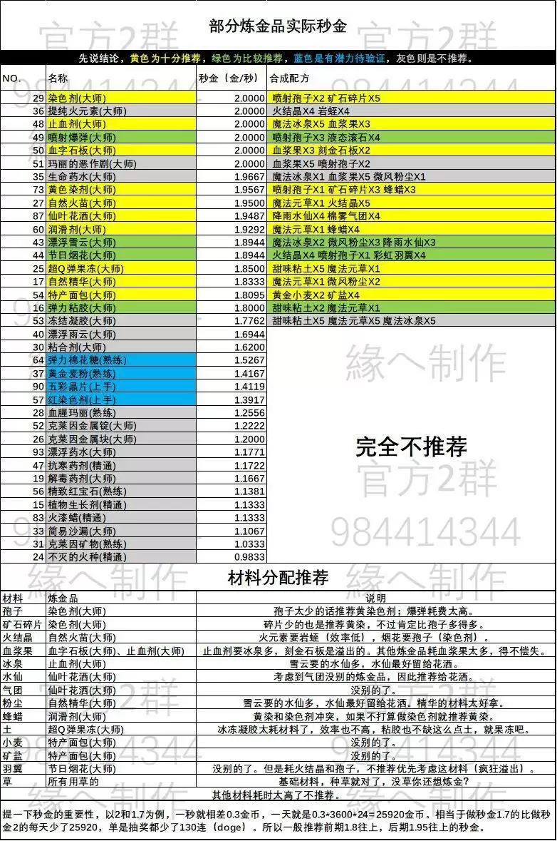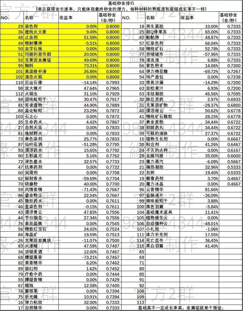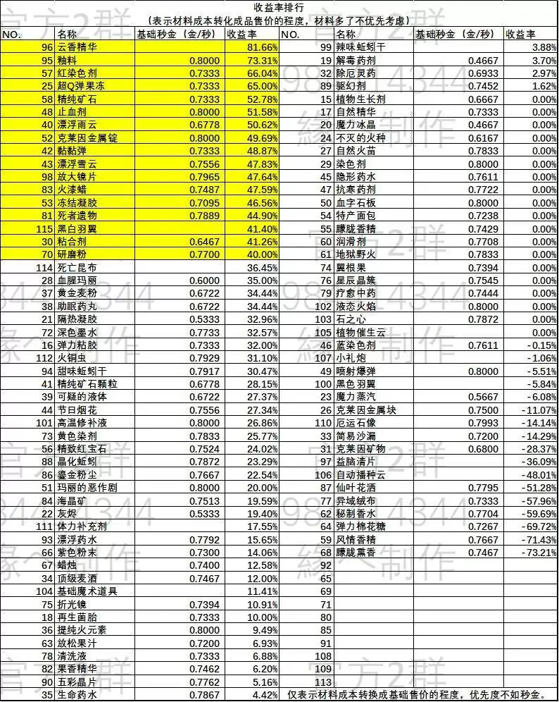 ps:此表以完美方案为准,其他方案会有点失真,不过大体没什么变化。还有就是,价格是1星的价格,3星成品收益率会更高,以及此表仅看净收益率哈,材料获得效率以及售卖效率详见实际秒金。