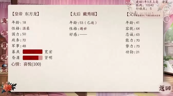 深宫曲游戏中父亲升职看功勋,功勋到一百自动升职,忠诚也不能太低,太低容易被皇上降职,可以给家里送钱提高功勋。不过由一品升国公主要条件是:父亲去世且势力>100可升国公。腹黑冷漠皇帝手下的应该是升不了国公!