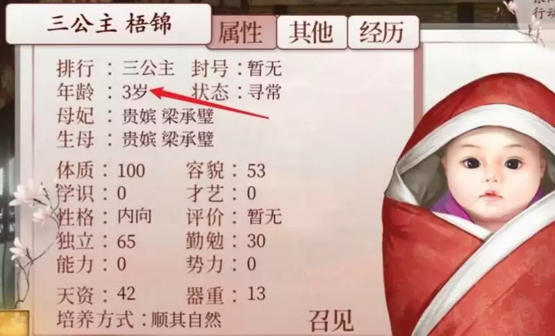 深宫曲游戏中孩子3岁12月下旬和14岁12月下旬会更新立绘,如果大家想要喜欢的孩子立绘,那么需要注意存档!在深宫曲寝居面板点击皇嗣管理选项处,点击皇子或公主可以去查看年龄,年满4岁可以换第一次立绘!