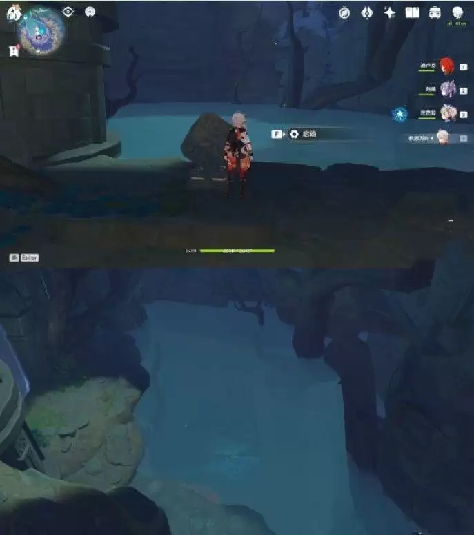 从洞口下去,击败机兵后再次启动机关,可以让水位再次下将