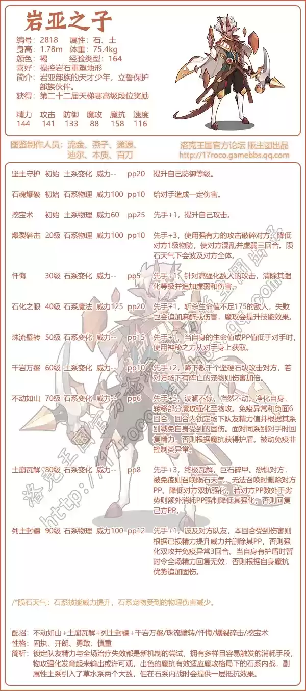 岩亚之子是第22届天梯结算宠物,性格上用固执、开朗、勇敢、慎重比较好。勇敢会增加10%攻击、减少10%速度;固执会增加10%攻击、减少10%魔攻;慎重会增加10%魔抗、会减少10%魔攻;开朗会增加10%速度、减少10%魔攻。