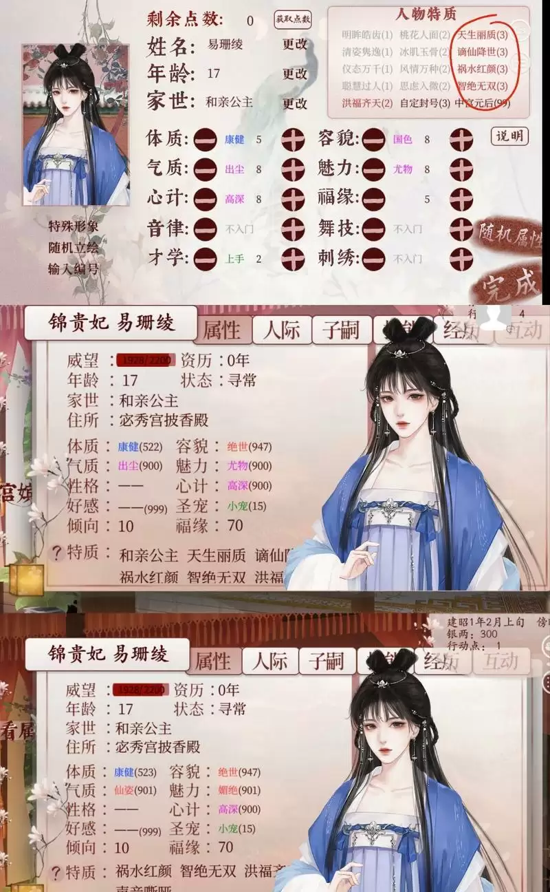 深宫曲游戏中想要个人属性达到900+可以:①初始右上角tag必点。②福源才艺酌情减少。③魅力气质,点数加到8 + tag,进宫后面板900(紫)。④逛御花园+1魅力,太液池+1气质,即900+属性(红)。⑤吃仙桃浆或老鸡金蛋。