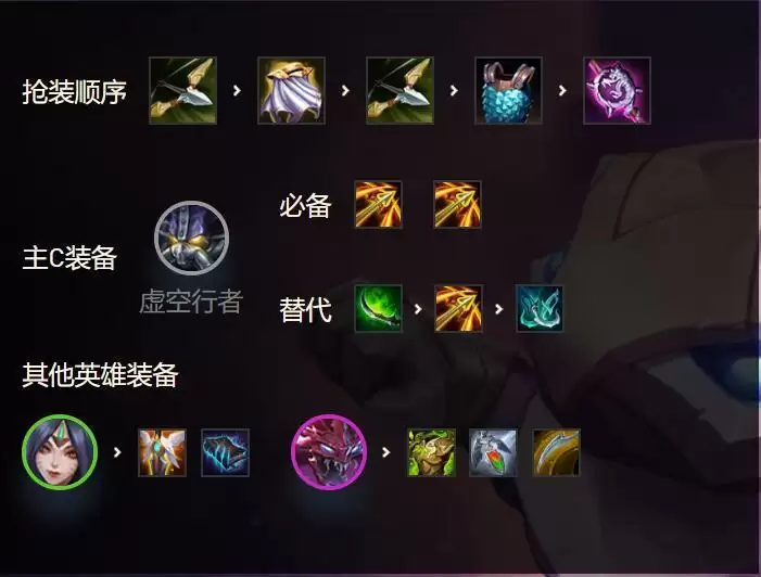 主C虚空行者(卡萨丁)装备给上分裂弓,分裂弓必备可替换降星刀龙爪反甲。