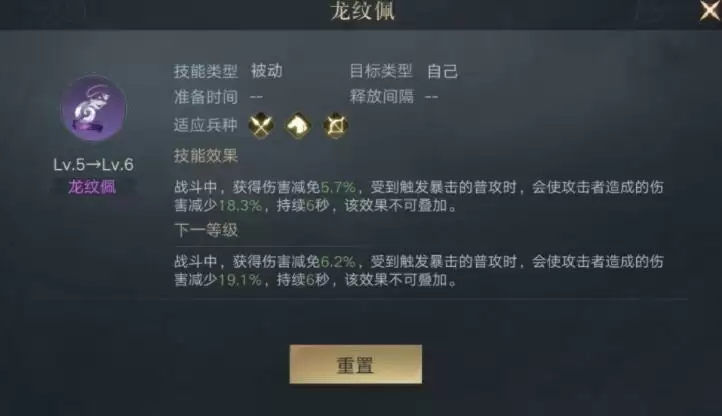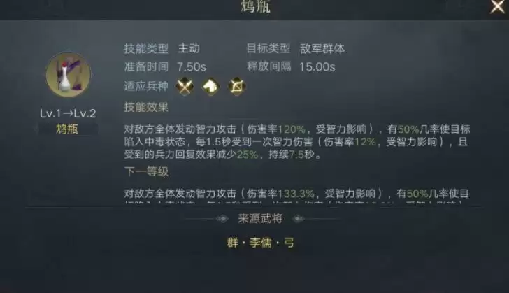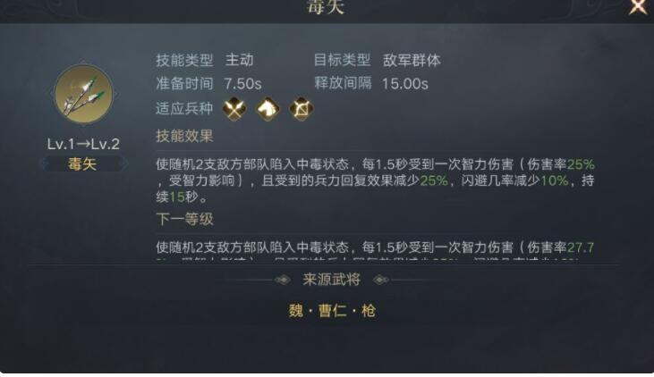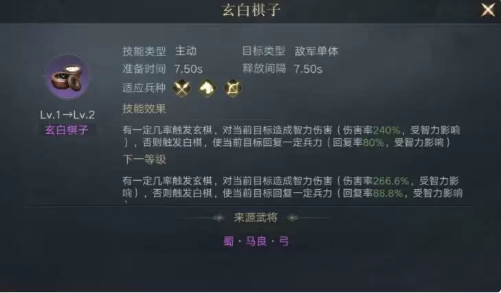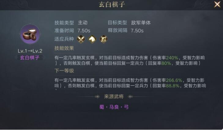 战斗中,每隔7.5秒,自身获得以下效果中的两种:兵力吸纳+12%,持续7.5秒;武力、统率、智力+15%,持续7.5秒;伤害减免+12%,持续7.5秒。